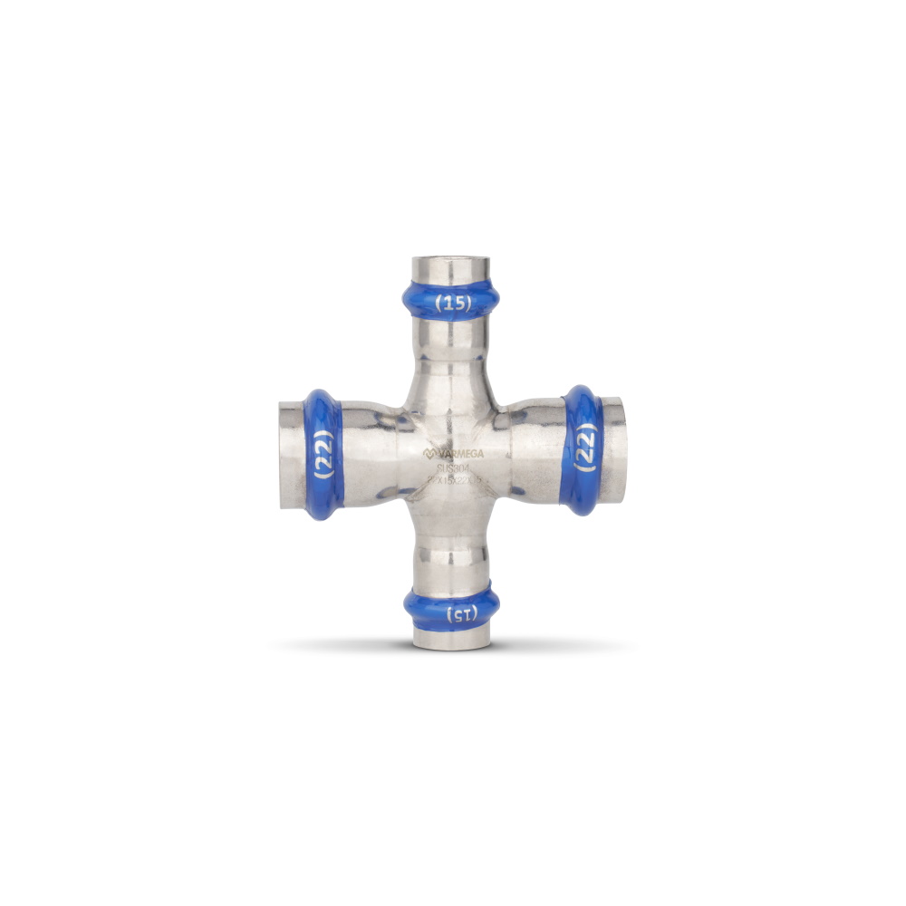 Крестовина раструбная Varmega Inox Press переходная, используется для соединения труб разных диаметров.
