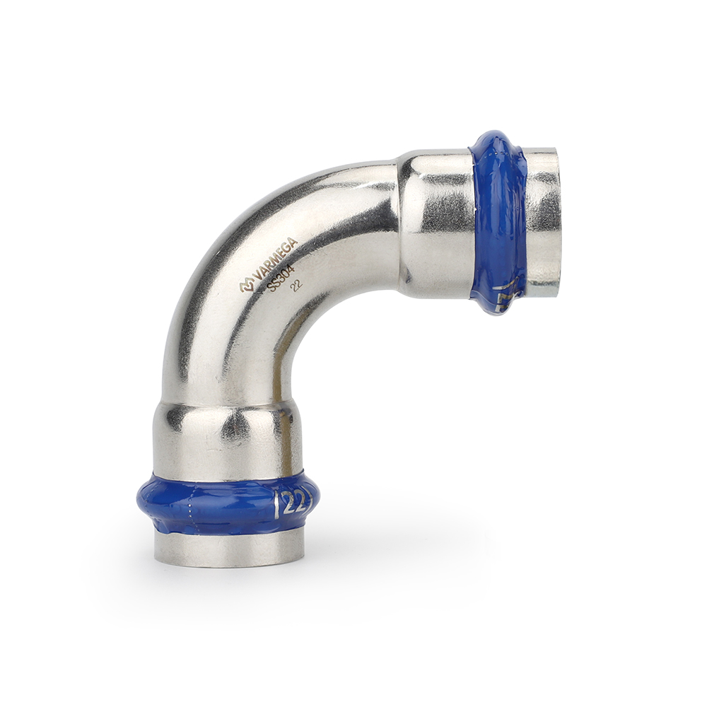 Угольник 90° двухраструбный Varmega Inox Press используется для соединения труб равных диаметров под углом 90 градусов. Для получения надежного неразъемного соединения трубы и фитинга потребуется специальный пресс-инструмент с насадками типа профиль «V».